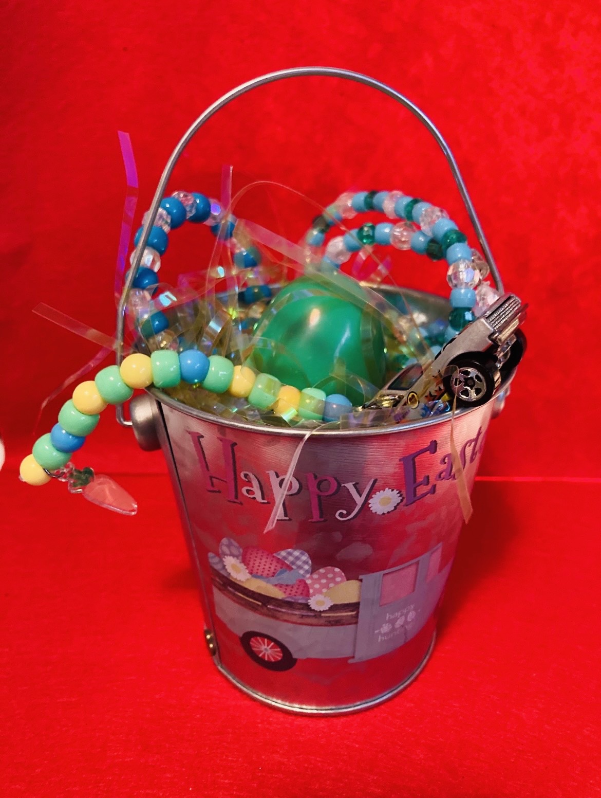 The Boy Easter Basket comes with a toy, plastic egg with candy, Keychain, Bracelet and Necklace.
