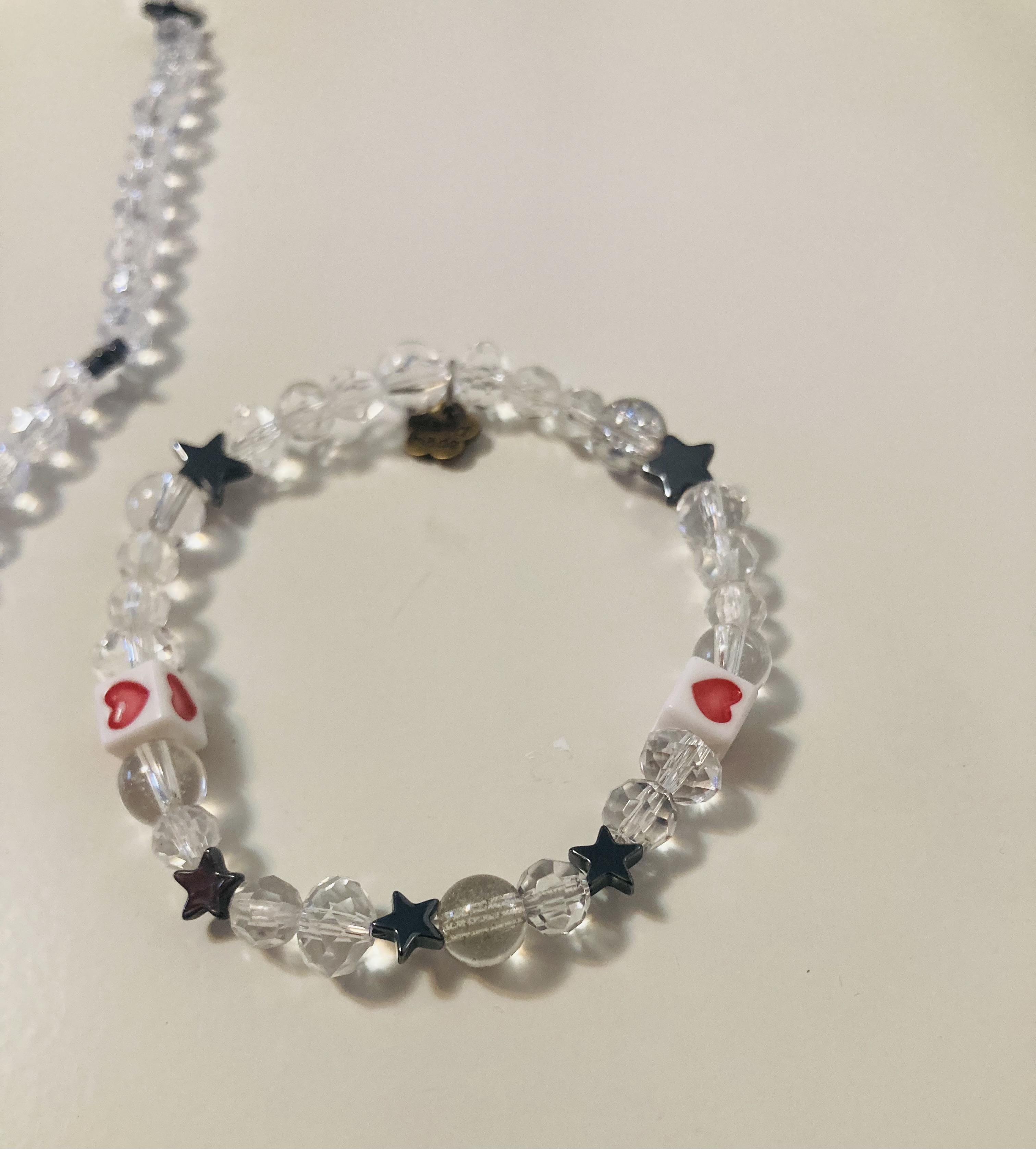 The bracelet has 4 stars, silver 2 white heart beaded clear beans smaller clear beans crystal clear beans with a hand tag on top